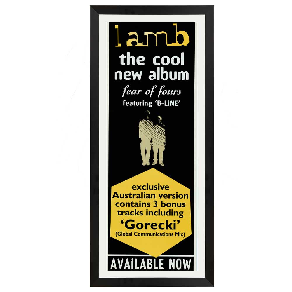 Celebrate the innovative sound of Lamb with this professionally framed vintage daybill poster promoting their album Fear of Fours. Highlighting the standout track B-Line and the exclusive Australian edition’s bonus tracks, including the iconic Gorecki (Global Communications Mix), this collectible is a striking tribute to the duo’s genre-defying artistry.