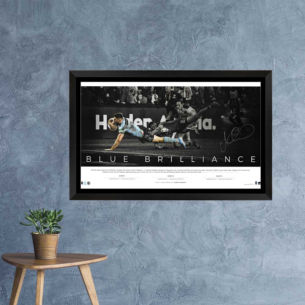New South Wales Blues State of Origin "Blue Brilliance" Icon Print Signed by James Tedesco Framed